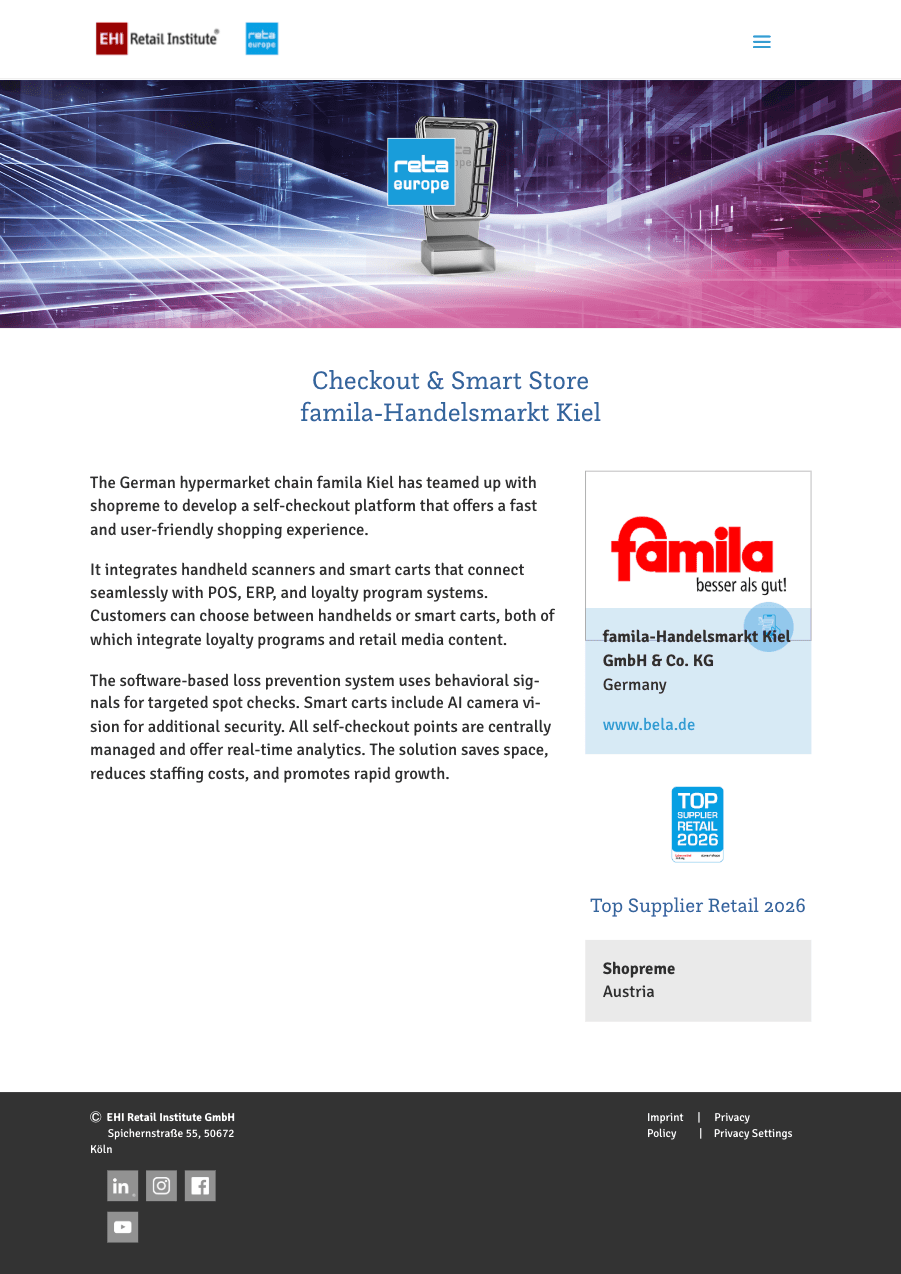 The German hypermarket chain famila Kiel has been selected as a finalist in the Reta Europe Retail Technology Awards 2026 for its innovative Checkout & Smart Store concept with shopreme as the technology partner.